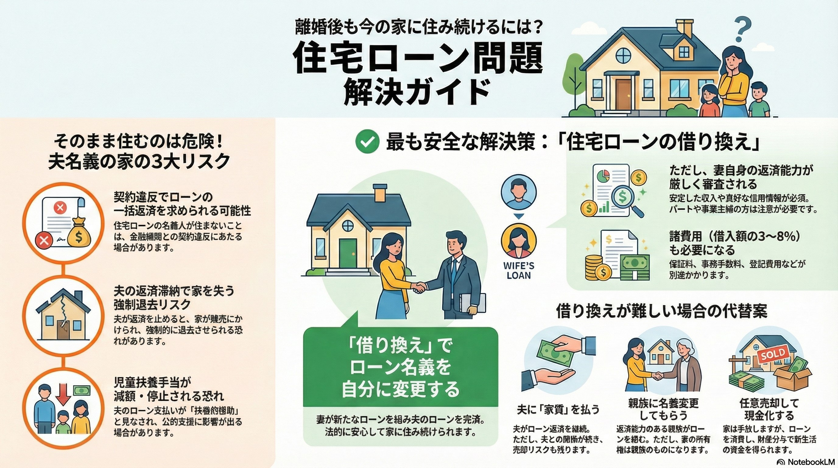 結論から申し上げますと、離婚後も妻が家に住み続ける場合、夫名義(または共有名義)の住宅ローンを放置するのは危険です。「妻名義への借り換え」こそが、将来の生活を守る唯一の解決策と言えます。